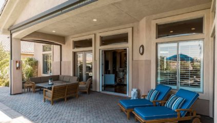 Transitional single story with mtn. view, no home behind. Volume ceilings, architectural details, French doors. Wood floors, shutters. Entertaining open floor plan, wet bar, master w/retreat walk in shower/jetted tub/fireplace/his-hers walk in closets. Bright kitchen, nook, breakfast bar, s/s appliances. Guest ste/office w/sep entry, full bath. Pool & BBQ