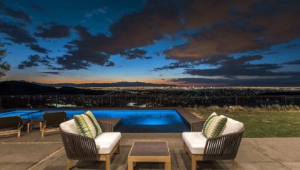 Encompassing comfort and style, this Marmol Radziner custom home is the epitome of desert contemporary living precisely designed for the majestic ASCAYA landscape. Developed as an inspiration home for this one-of-a-kind community, the estate offers only the keenest elements and materials found in a luxury home today. Striking modern architecture greets you upon arrival. Floor-to-ceiling sliding glass line the rear elevation of the home, showcasing cityscape views while creating a seamless transition from indoor to outdoor living. The warm hues of wood and extensive rustic stone bring balance to the sleek glass and steel design. Earthy materials and color palettes were specifically selected to connect this home to its desert environment – bronze anodized aluminum panels, vertical grain western red cedar, and local natural stone – wrap from interior to exterior. On the ground floor, a warm gray concrete topping slab also extends from the inside out. Subtle yet high-grade, the kitchen is outfitted with luxury appliances and makes entertaining effortless with its view of the entire home. In addition, the adjacent wet-bar with floating glass wine cellar presents a resort-like ambiance fit for all occasions. Also on the main level, there is a spacious office, gym, powder room, and guest suite that can be found on the west wing. Plus, a comfortable media room, all of which encompass the million dollar views. To maximize the nearly half acre lot and Las Vegas views, the outdoor entertainment spaces were pivotal to the design. Trees were placed to highlight architectural features and connect the greenery to the interior spaces. The architecture and landscape provide protection from the elements, to create usable outdoor spaces despite the extreme desert climate.From sunbathing in the pool to gathering around the outdoor fireplace, the glittering Strip views are never out of site.
