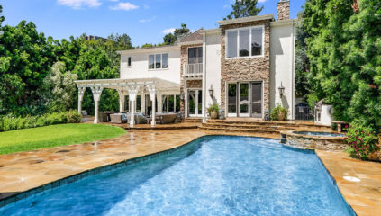 Beautifully renovated East Coast inspired compound located on a quiet cul-de-sac just minutes from the heart of Beverly Hills. Situated on a street-to-street flat lot of over 16,500 sq.ft., this property was the former home of Glenn Frey, founding member of the rock band the Eagles, and also famed actor James Cagney. Enjoy sophisticated Hamptons-style living in this wonderfully updated home. The picturesque front façade invites exquisite curb appeal with delightful turreted entry, two-car garage, and additional porte cochere parking. The formal foyer leads into the step-down living room with vaulted and beamed ceiling, beautiful stone wall with fireplace, and built-in bar. The large formal dining room with doors opening to the covered back patio offers great space for indoor and outdoor dining and entertaining. The spacious gourmet kitchen features professional appliances, abundant cabinetry, expansive marble countertops with breakfast bar, and breakfast area. There are two family bedrooms, an office with built-ins, loft den, and master suite with custom walk-in closets and luxurious bath. The completely private park-like grounds offer a tranquil retreat and fabulous entertaining space with covered and open patios, built-in BBQ, gas firepit with built-in seating, wood-burning fireplace, pool and spa. The detached guesthouse has its own private gate and separate entrance from the main house, motorcourt, and two-car garage.