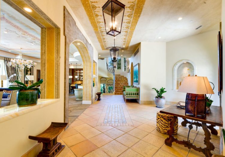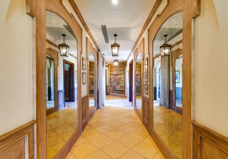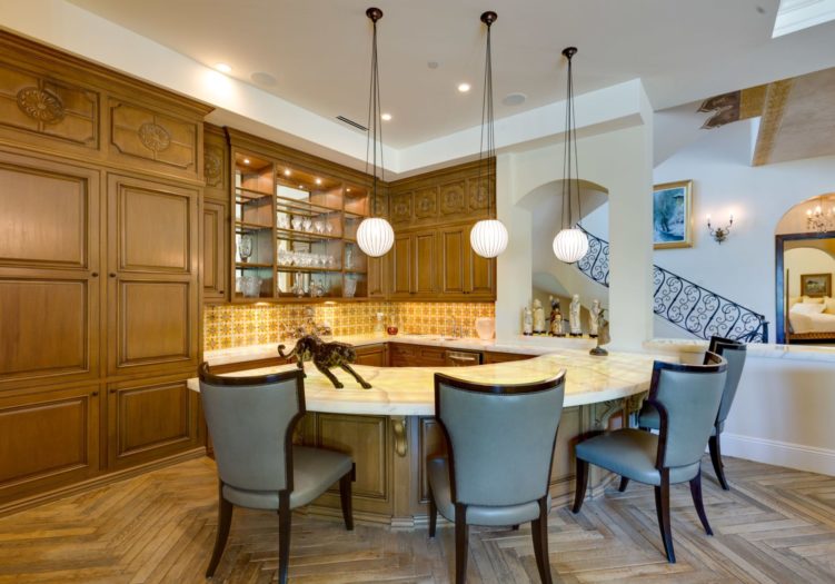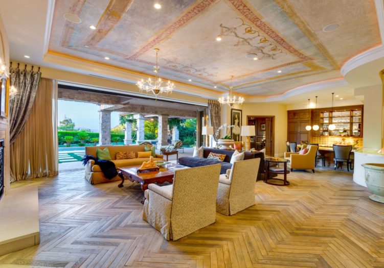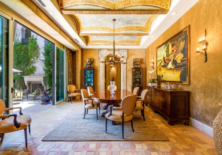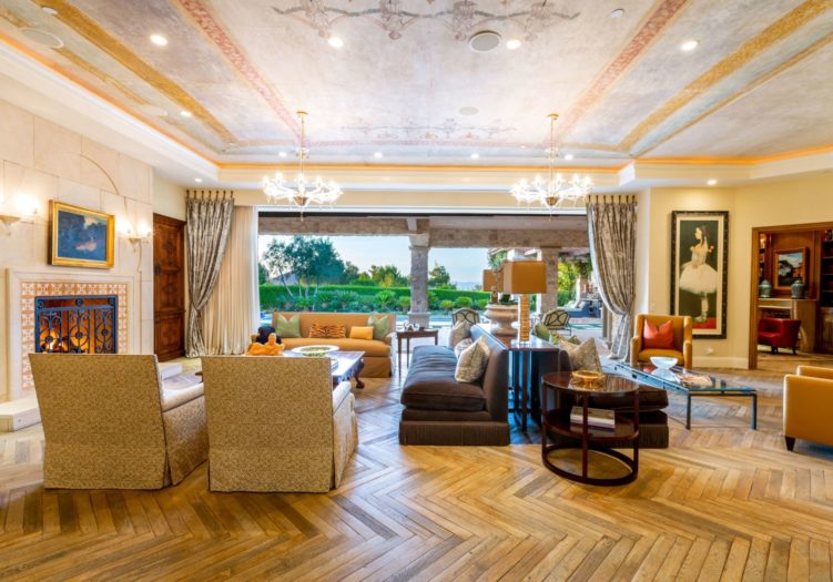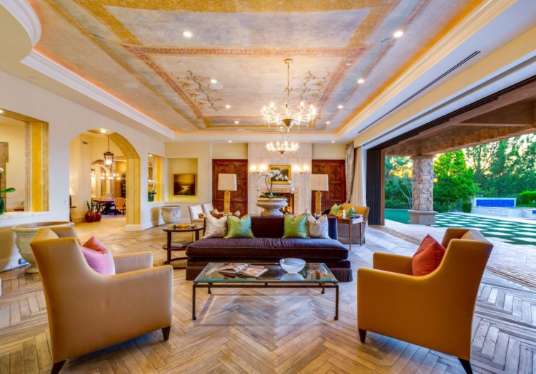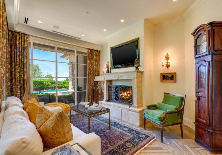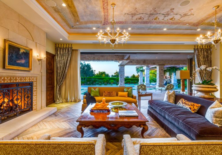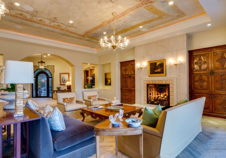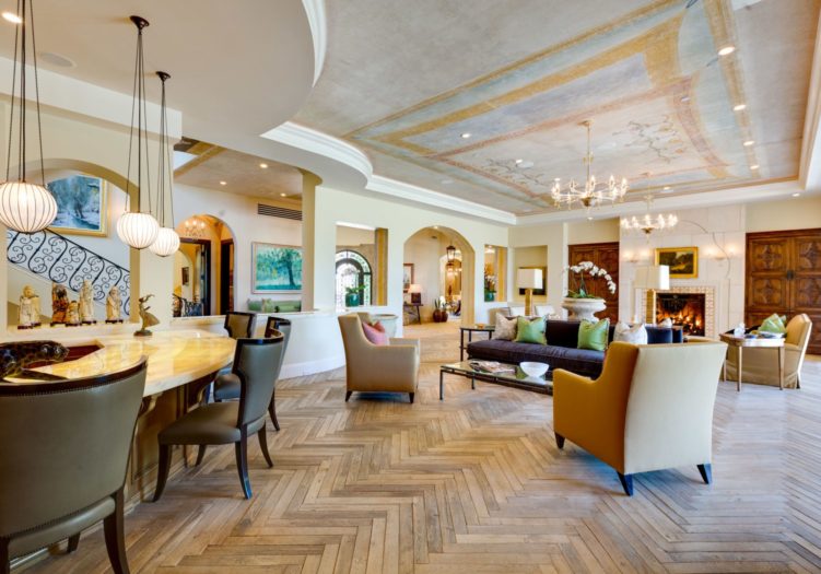 As you enter the home, you are immediately struck by an awe-inspiring setting. Views of the beautiful pool area, reclaimed French Oak floors, breathtaking hand-painted ceilings, exceptional detail, and quality craftsmanship extends before you. The great room features back to back sofas to divide the expansive space, on one side is a wet-bar that features the most beautiful onyx top, bringing a slight contemporary tone to the home, adjacent from built-in custom, hand-carved cabinetry that houses a television next to one of 9 antique stone fireplaces found throughout the home. A wall of pocket doors opens to the incredible backyard with a large covered patio, outdoor fireplace, additional entertaining spaces, a classic pool design and plenty of room to roam.