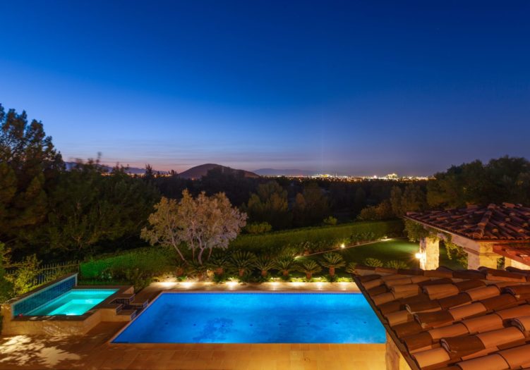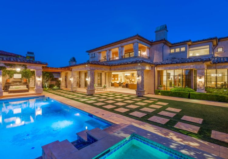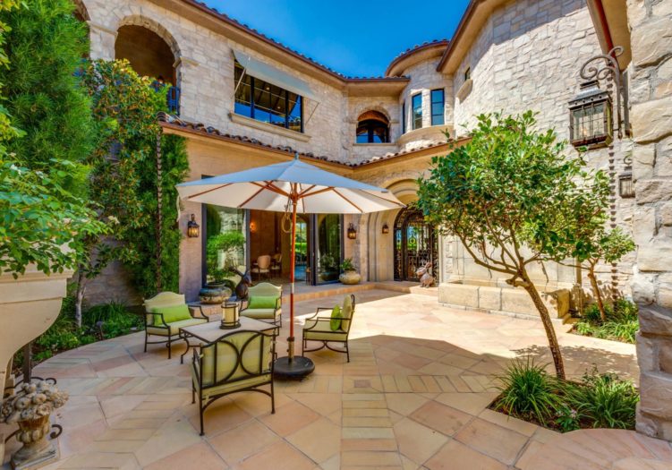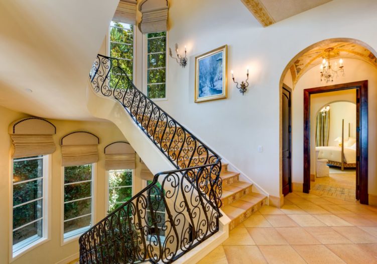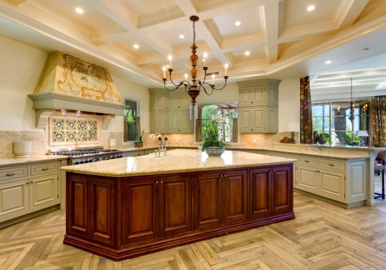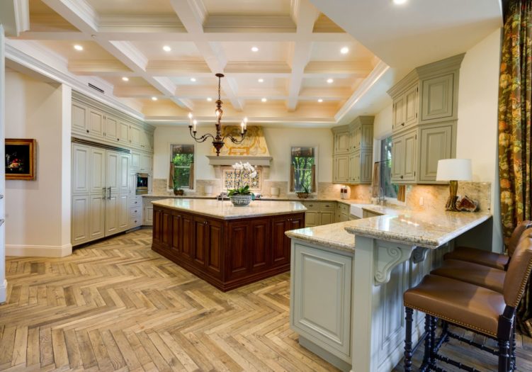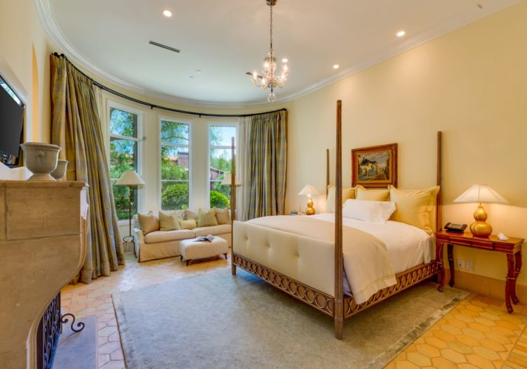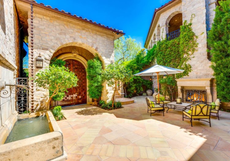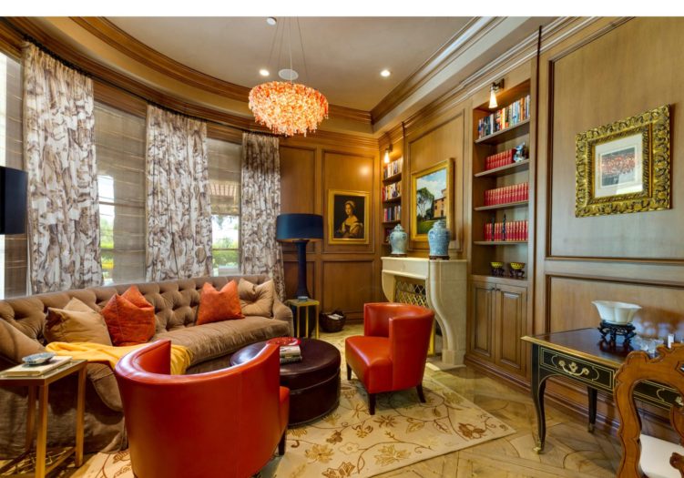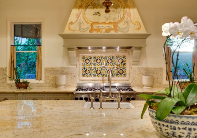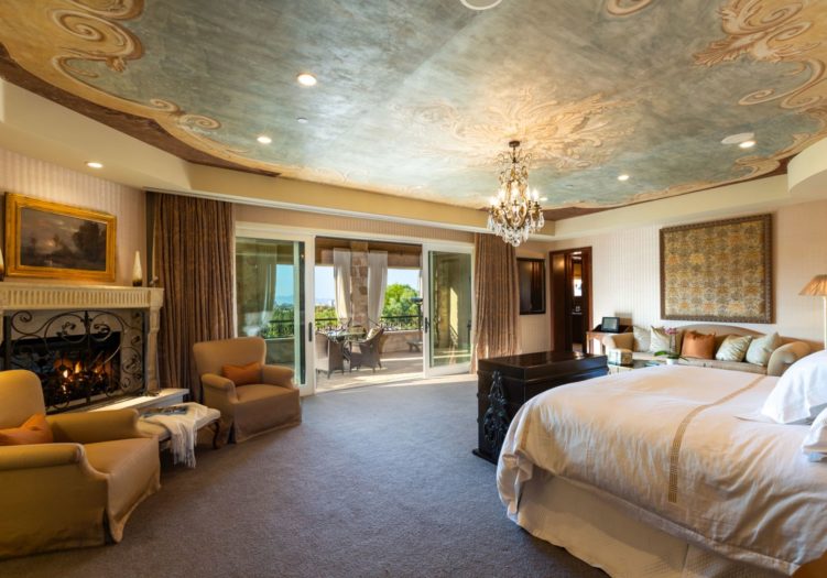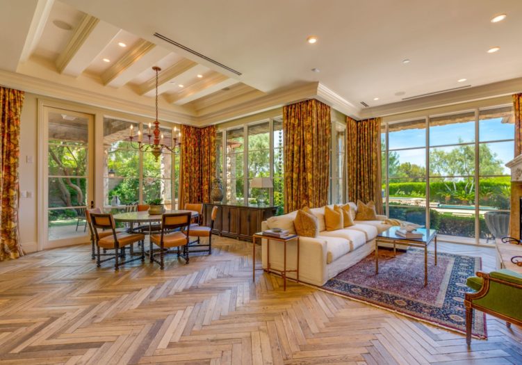 As you enter the home, you are immediately struck by an awe-inspiring setting. Views of the beautiful pool area, reclaimed French Oak floors, breathtaking hand-painted ceilings, exceptional detail, and quality craftsmanship extends before you. The great room features back to back sofas to divide the expansive space, on one side is a wet-bar that features the most beautiful onyx top, bringing a slight contemporary tone to the home, adjacent from built-in custom, hand-carved cabinetry that houses a television next to one of 9 antique stone fireplaces found throughout the home. A wall of pocket doors opens to the incredible backyard with a large covered patio, outdoor fireplace, additional entertaining spaces, a classic pool design and plenty of room to roam.