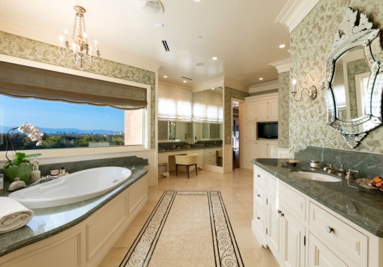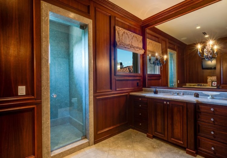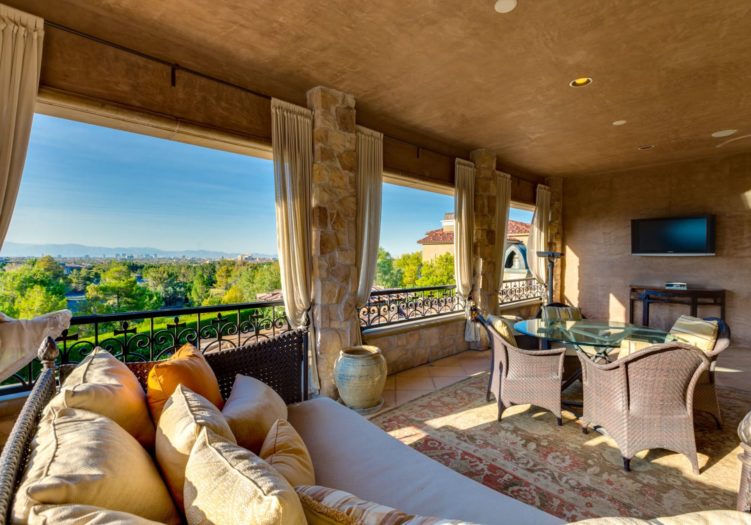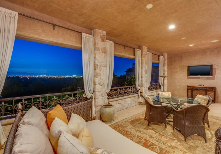 The upper master bedroom floor includes a tranquil guest bedroom en suite, a tremendous walk-in closet, and a private balcony. As you walk down the hallway with antique mirrors, exquisite custom light fixtures cast a beautiful glow, and the master bedroom greets you with double mahogany entry doors that add a grand, luxurious feel. The stone fireplace in this room creates an intimate and inviting ambiance. You are immediately drawn to the outside balcony with Strip, mountain and golf course views. Separate custom designed his and her bathrooms, walk-in closets, and dressing areas were a must. Each bathroom has exquisite stone detailing, towel warming drawers, televisions for your morning news, and lots of natural light. A convenient coffee bar is located off of the master bedroom, perfect for fixing your morning café-au- lait to enjoy on the expansive covered terrace.