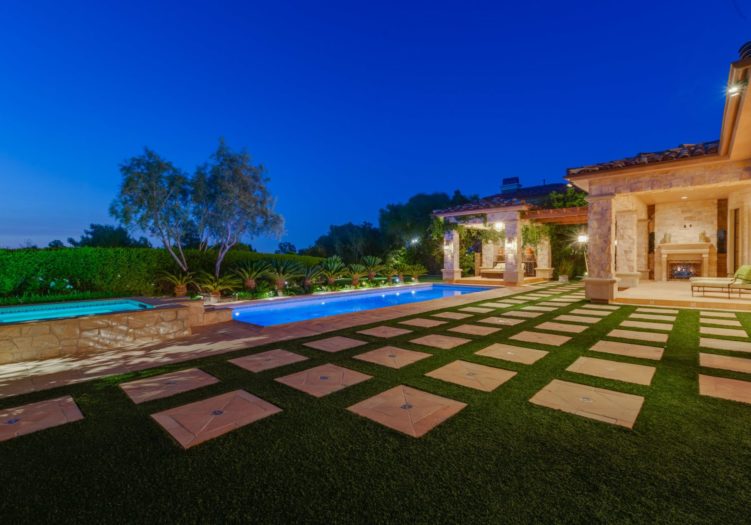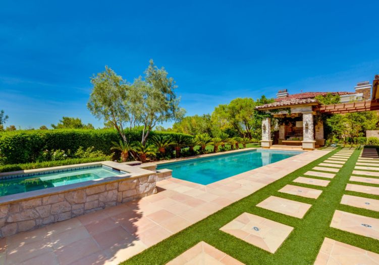 This home features an outdoor kitchen with multiple dining areas, a no-chlorine pool, perfect for morning laps, a nice size yard with synthetic grass, a dog run on the side of the house, outdoor speakers, and beautiful well-established landscaping. Plus, there is a large 4-car climate-controlled garage with abundant storage.