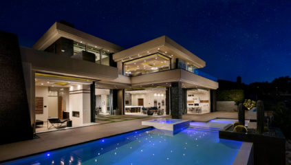 This ultra-deluxe residence embodies aspiration and exceptional design within its clean modern aesthetics of beauty, form, and function. This higher level designer custom home was just recently completed, has never been lived in and is truly exquisite. The visually stimulating architecture is layered with dimension at every angle from front to back. Strategic functionality combined with warm elegance and innovative planning sets the stage for a lifestyle that embodies necessity and tranquility. A private-gated entrance opens to an impressive motor court with a 7-car garage. Beyond an oversized, glass and steel entry, you are welcomed to one of a kind indoor-outdoor living spaces, wide expansive views, and razor sharp professional designed rooms throughout. The spacious main level offers 4-bedroom en-suites, an in-home private cinematic theater, casual and formal living/dining spaces, an entertainer's backlit Quartzite bar, and the latest in a contemporary designed gourmet kitchen with top of the line appliances and custom cabinetry. The second level includes a sizable fitness room with steam shower and its own outdoor patio. The secluded master retreat, tranquil bathroom, and custom closet are fit for royalty. This designer showcase suite opens to an expansive terrace that overlooks the entertainment capital of the world, the Las Vegas Strip. Other features include a sixth bedroom guest casita located in the courtyard with its own entrance, dedicated home office and sleek resort pool and spa offering an outdoor space to enjoy this desert masterpiece all year long. This brand new, turn-key optioned modern beauty has been professionally designed inside and out.
