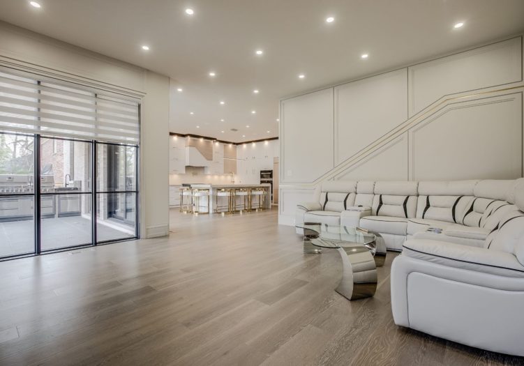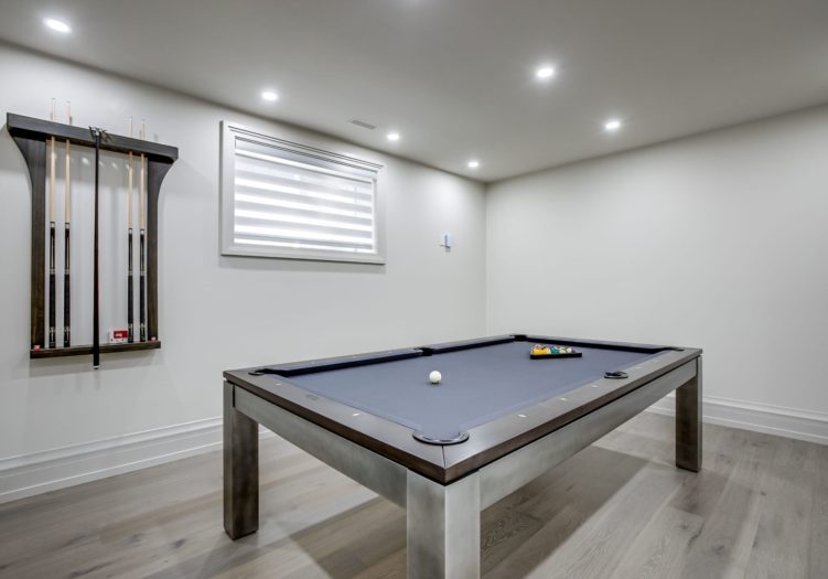 The Billiards Room, open in design to the Billiards Room, features heated wide plank pre-engineered hardwood floor, pot lights and a window outfitted with custom blinds.
