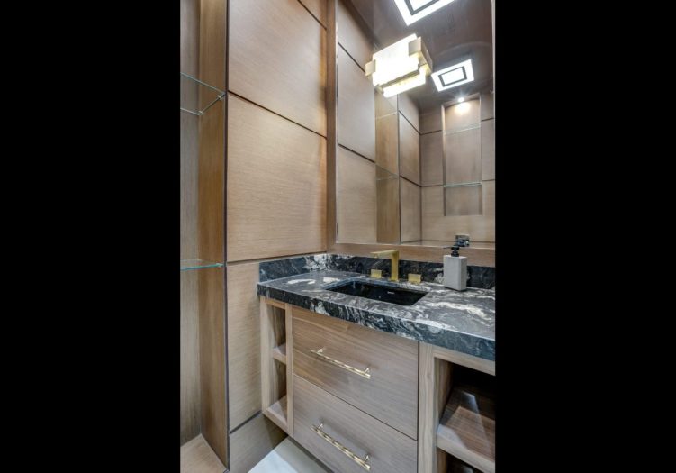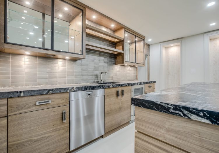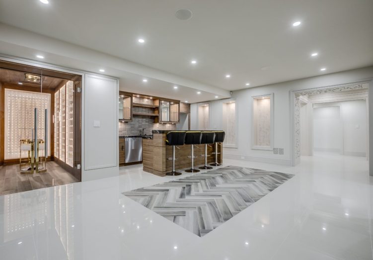 The Wet Bar, open in design to the Recreation Room and Billiards Room, features custom designed and crafted cabinets all on a soft close, pot lights, heated porcelain tile with a custom herringbone inlay, a two-tiered stone bar, tile backsplash, illuminated shelving with a mirrored backsplash, under valence lighting, several glass front cabinets, illuminated art niches and a stainless steel under mount sink.