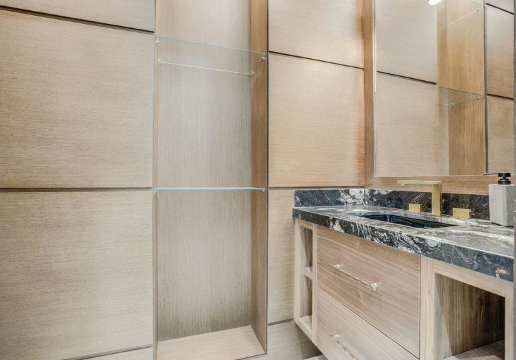 The two additional walk-in closets, entered through glass entry doors, features wood paneling, shoe shelving, drawers and open display shelving.