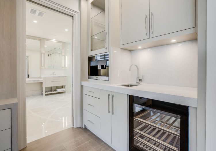 The Wet Bar features a Miele bar refrigerator, quartz countertop and backsplash, under valence lighting, custom cabinets, several glass front cabinets and a stainless steel under mount sink.