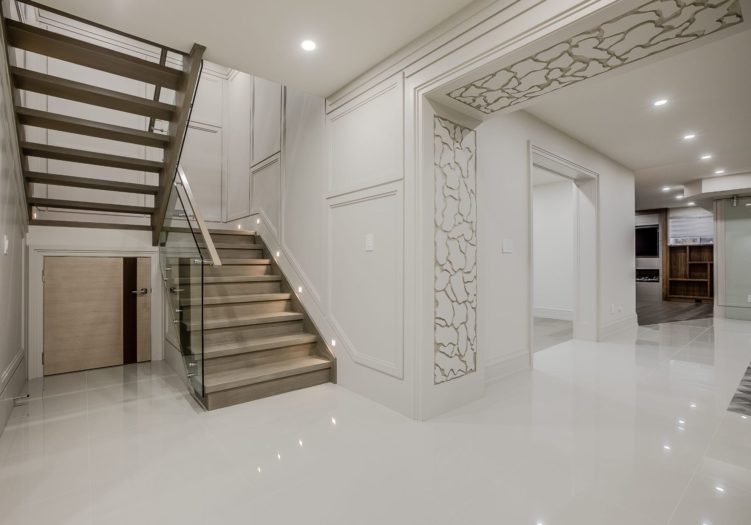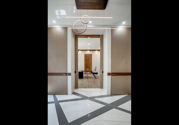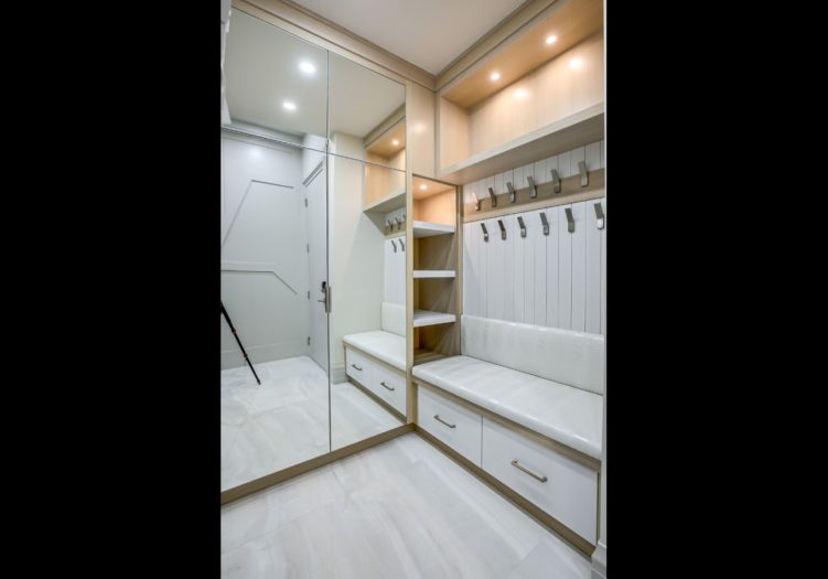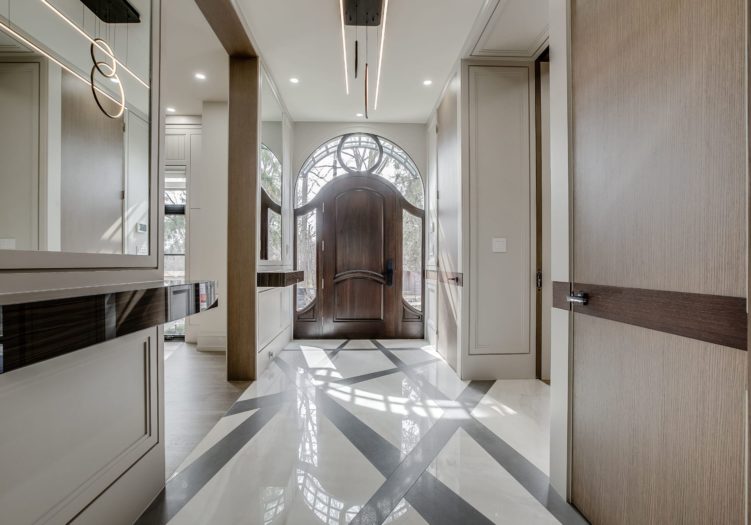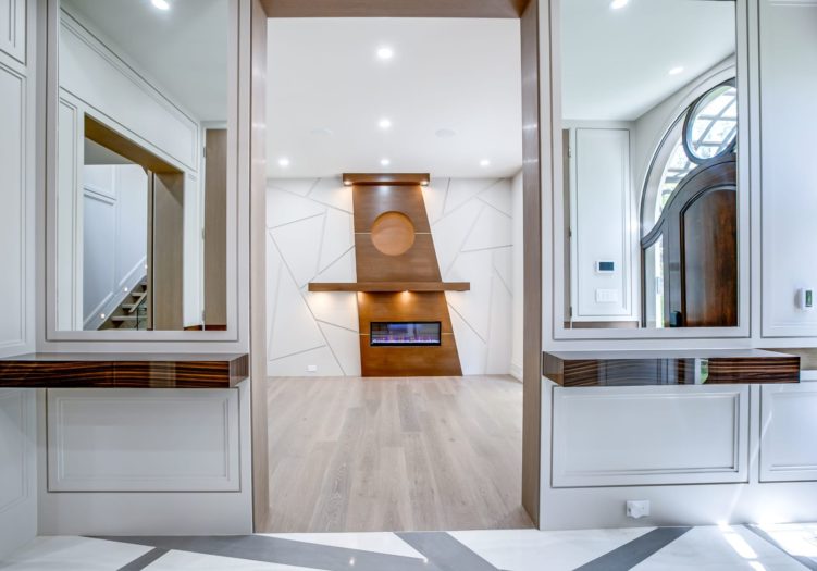 The Foyer features a solid wood entry door with side transom and upper valence window, heated porcelain floor with a custom inlay design, two interior wood paneled cloak closet, a light fixture, pot lights, flush floor registers, a custom floating shelf, floor-to-ceiling recessed paneled walls with integrated mirrors and entries to the Library and Living Room.