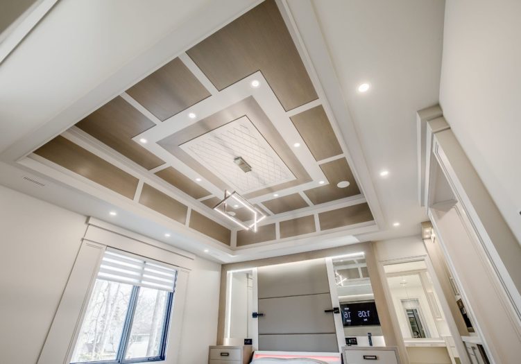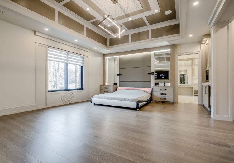 The Bedroom area features wide plank hardwood floor, pot lights, floor-to-ceiling recessed paneled walls, an anteroom, built-in speakers, an electric fireplace with a floor-to-ceiling wood mantle with an illuminated frame, a light fixture, wood paneled ceiling, windows outfitted with custom blinds overlooking the rear gardens, a custom designed circular inlay, a custom built-in back lit padded head board, mirrored details and built-in night tables.