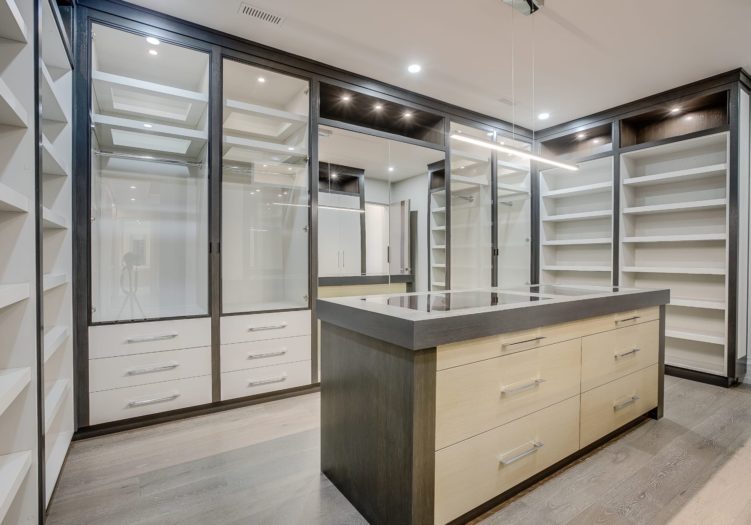 The Dressing Room, entered through two separate doorways, features wide plank hardwood floor, pot lights, a light fixture, custom floor-to-ceiling cabinets comprised of open and closed cabinets, mirrored cabinets, several glass front display cabinets, long and short hanging capabilities and an expansive glass top center island complete with ample drawers.