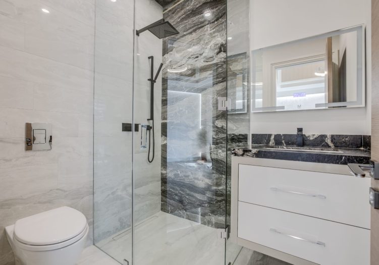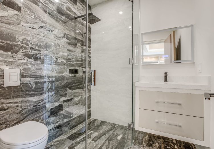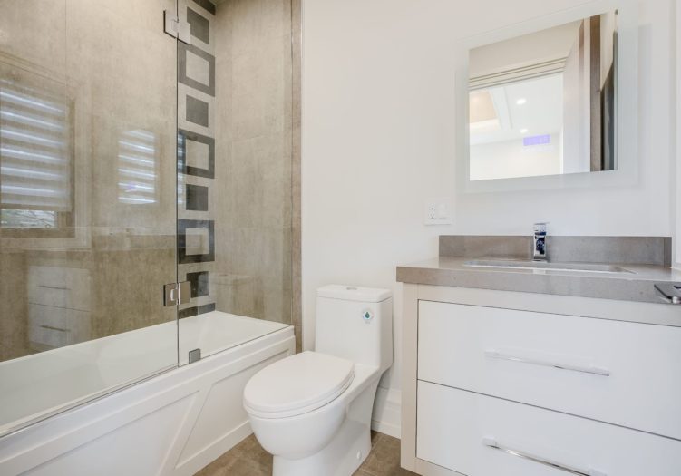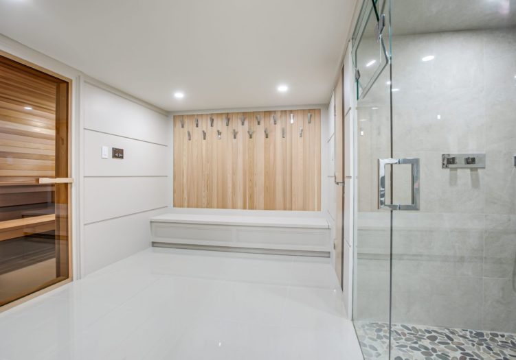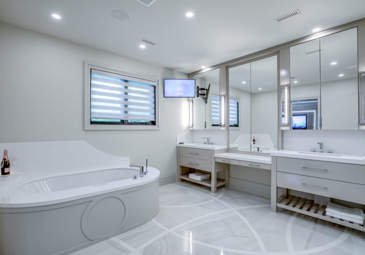 The luxurious 10-piece ensuite bath, features heated porcelain tile floor with a custom inlay, pot lights, built-in speakers, a window outfitted with custom blinds overlooking the side gardens, a deep soaker acryline airjet tub with a custom surround, custom wall-to-wall built-in vanitites with “His” and “Hers” under mount sinks, a custom makeup area, light sconces, quartz countertop, mirrored cabinets, an expansive seamless glass shower complete with a built-in bench, soap box, steam unit, body jets, handheld faucet and a rain shower head. The Ensuite also features a water closet housing a toilet and bidet.