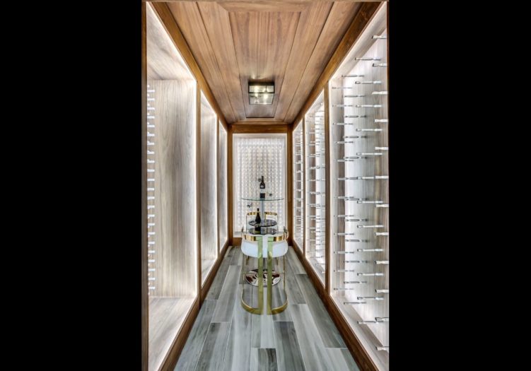 The spectacular temperature controlled Wine Cellar, entered through a pair of glass doors, features custom illuminated wine shelving, faux wood tile floor, a light fixture and paneled walls and ceiling.