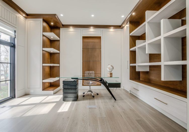The grand Library, entered through a pair of pocket doors off of the Foyer, features contemporary wood crown molding trim, pot lights, wide plank hardwood floor, floor-to-ceiling recessed paneled walls, a picture window outfitted with custom blinds overlooking the front gardens, illuminated open display shelving, glass shelving and a custom wall-to-wall built-in complete with open and closed cabinets.
