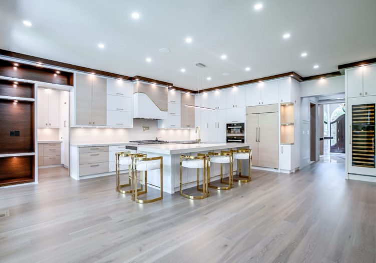 The Gourmet, chef inspired Kitchen, open in design to the Family Room and Dining Room, features a central vacuum kick sweep, wide plank hardwood floor, pot lights, built-in speakers, a light fixture, illuminated open display shelving, custom designed and crafted floor-to-ceiling cabinetry, contemporary wood crown molding, under valence lighting, quartz countertop and backsplash, a pot filler, pull out spice rack, a wall of windows overlooking the rear gardens and a sliding glass door opening onto the rear terrace and gardens. The Kitchen also features an expansive waterfall center island with wood accents, an under mount sink and a large breakfast bar.
