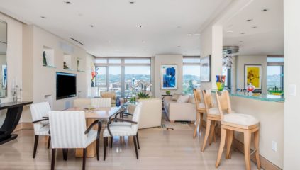Rare and desirable double-unit in one of the most prestigious full-service buildings on the Wilshire Corridor, the Californian. Pristine and sophisticated condominium consisting of apx. 5,280 sq.ft. of living space with 4 bedrooms and 4.5 bathrooms and boasting stunning panoramic views throughout. Elevator opens directly into private foyer leading into the spacious and bright public rooms with flowing, open floor plan. Living room with built-ins, formal dining room with elegant built-in bar, family room, and spacious gourmet kitchen with center island, professional appliances, balcony, butler’s pantry, and adjoining breakfast room. The luxurious master suite is much like its own private residence complete with lounge/office space, balcony, oversized custom walk-in closet with island, and gorgeous master bathroom with separate tub and shower and dual vanities. Three additional bedroom suites, powder room, and laundry room complete this fabulous unit. Five-star building amenities include concierge, valet, fitness center, pool and spa.