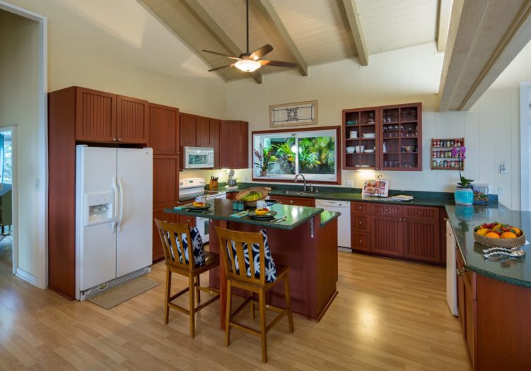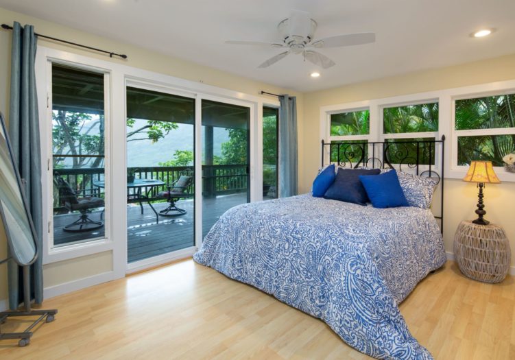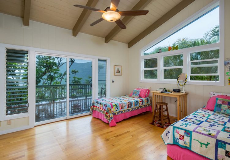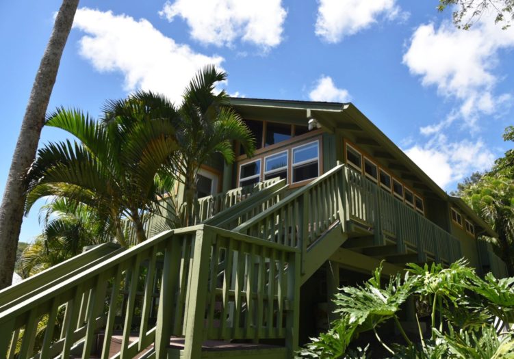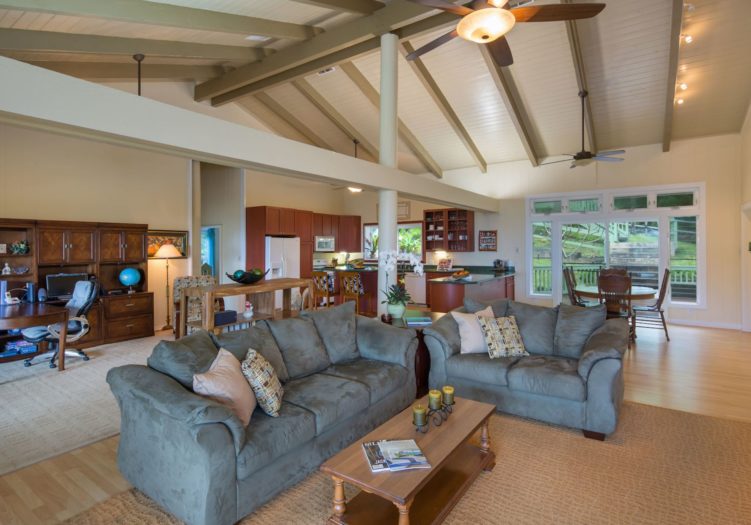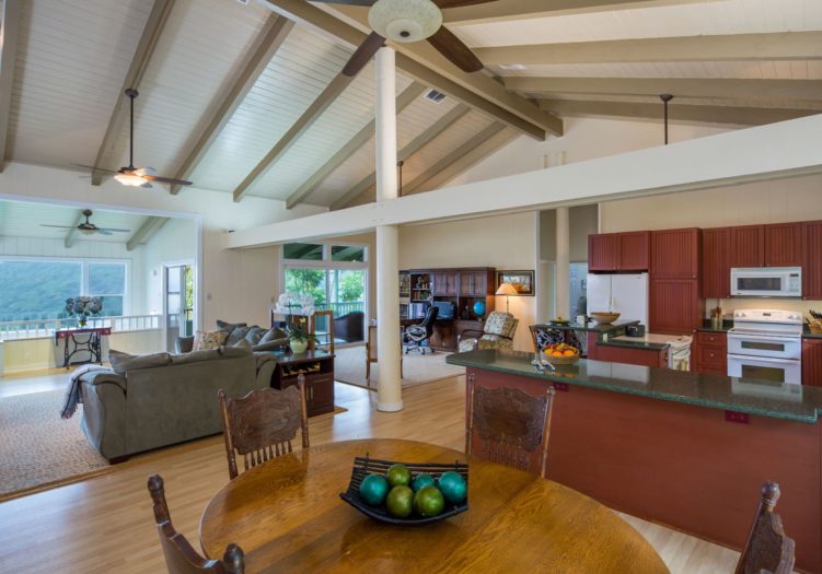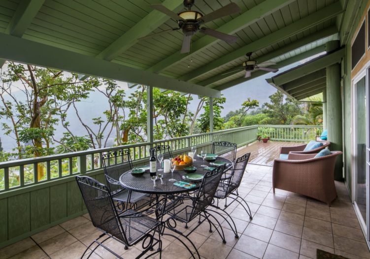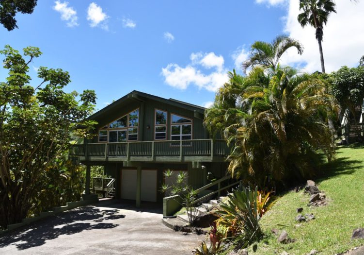 Stunning ocean, mountain and coastal views abound from this lush tropical hillside estate at the top of Hahaione Valley.