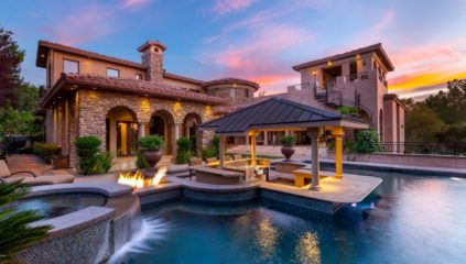 Architecturally significant. Welcome to 3 Sankaty, where stunning interior design, impressive architectural features, and a phenomenal backyard oasis come together to create one dazzling estate. This entertainer’s paradise on a lush, oversized corner lot brings luxury retreat-living right to your doorstep. Designed by Pinnacle Architecture, this nearly 7,000 square foot residence showcases a gorgeous great room combined with a gourmet Wolf kitchen, 4 bedroom en suites including a first-floor master, home office, theater room, upstairs loft, and a covered loggia with full Strip views. Enjoy the magnificent backdrop year-round with an outdoor bar and fireplace. Enhanced by rich trey ceilings and beautiful built-ins, the great room offers indoor-outdoor living with pocket doors, an entertainers’ bar, and exquisite fixtures. The back patio seamlessly blends with the interior and perfectly frames your ultimate backyard escape. The sparkling mosaic-tiled pool beckons you with fountains, fire pits, a swim-up bar and a sunken outdoor kitchen with audio/visual entertainment. From the impressive foyer with interior fountain to the 2,000 bottle temperature-controlled wine cellar, this custom home features the best of the best. Polished marble and rich hardwood floors guide you from room to room as sconces light up the intricate hallways. The retreat-style master opens up to the backyard with separate his/hers closets that wrap around to the downstairs laundry room. There is also a convenient guest en suite located on the main floor. Creston home automation simplifies your needs while 8 security cameras surrounding the home provide peace of mind. An abundance of storage and a keen eye for detail leaves little to be desired within this exceptional custom estate.